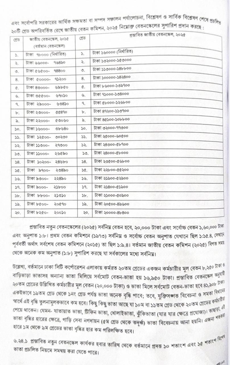 প্রস্তাবিত নতুন বেতন স্কেলের সর্বনিম্ন বেতন হবে, ২০,০০০ টাকা এবং সর্বোচ্চ বেতন ১,৬০,০০০ টাকা এবং অনুপাত ১:৮। আজ প্রধান উপদেষ্টার কাছে জমা দেওয়া প্রস্তাবিত পে স্কেলে এমনটাই সুপারিশ করা হয়েছে। প্রধান উপদেষ্টার প্রেস সচিব শফিকুল আলম বিষয়টি নিশ্চিত করেছেন।